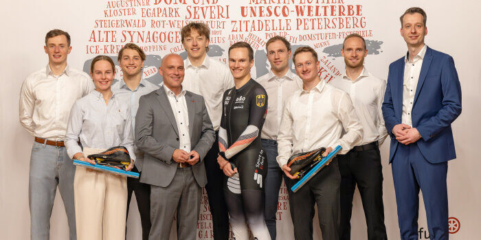 Im Rahmen der Verabschiedung der neun Athleten zum ISU Eisschnelllauf-Weltcup 2025/26 präsentierten die Eisschnellläufer um Hendrik Dombek, der mit dem Eissportclub Erfurt e.V. trainiert, auf dem Oberschenkel ihrer Rennanzüge den Aufdruck der Sportkampagne „Sport in Erfurt“ im Rathausfestsaal.